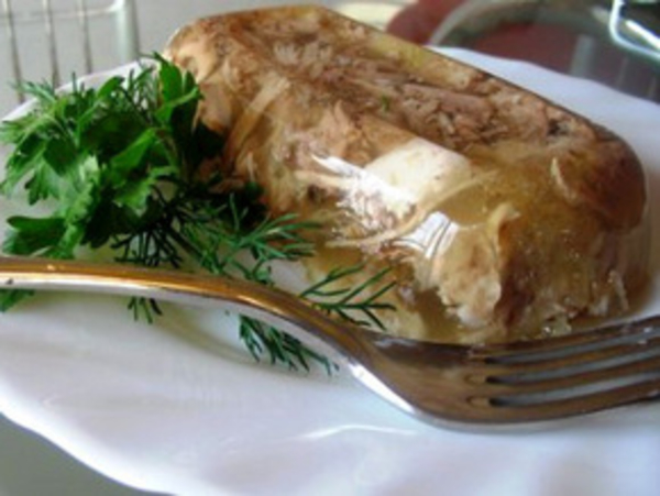 Аккуратно залить мясо бульоном, охладить и убрать в холодильник до полного застывания. Подавать холодец лучше всего с хреном, горчицей и с зеленью.