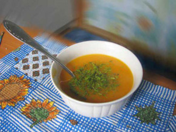 Морковь с бульоном взбить блендером, добавить апельсиновый сок и довести до кипения.