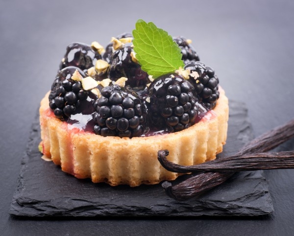 Тесто распределить по формочкам руками. Прижать грузом. Это тесто не вздувается, но края могут сползти. Печь при 200 С 15 минут. Остудить корзинки и наполнить лимонным кремом. Разложить ягоды ежевики.