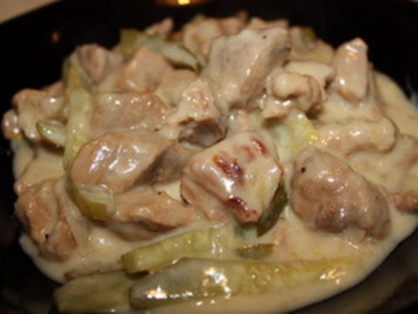 Доводим до кипения, тушим 5 минут, затем вливаем сливки и прогреваем до нужной температуры. Подаем с картофелем.