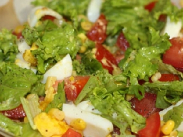 Листья салата порвите или порежьте небольшими кубиками. Яйца отварите, разрежьте пополам и нарежьте дольками.