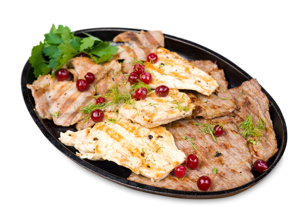 Кусок мяса вымыть холодной водой, сделать в нем глубокие надрезы. В углубления положить клюкву, бруснику или зерна граната, соединенные с давленным чесноком и перцем горошком.