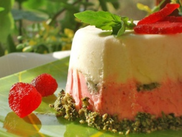 Приготовить формочки для суфле. Выложить в формочки слоями клубничную и ананасовую часть десерта, между слоями добавляя немного песто.