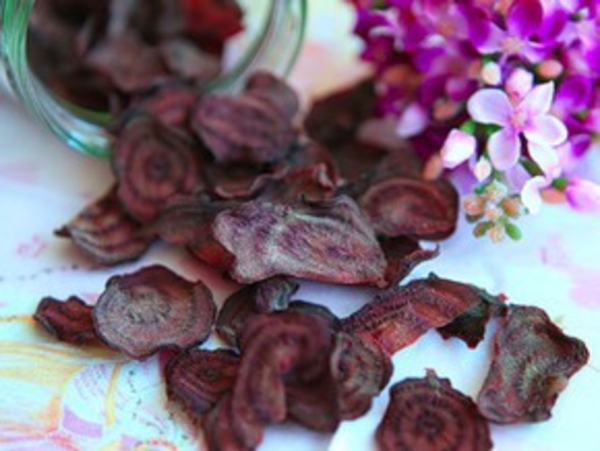 Маринованную свеклу выкладываем на противень, застеленный бумагой для выпечки и сушим 2 часа при 100 градусах.