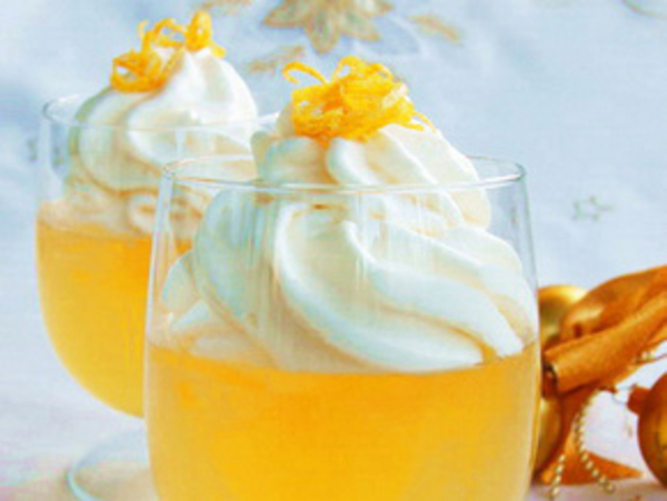 Приготовить крем: смешать в миске шампанское, лимонный сок, сахар. Влить в сливки и всё взбить до густой пены.