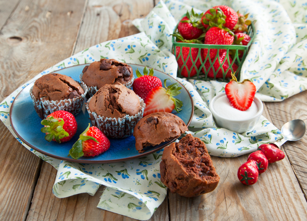 Клубнику нарезать небольшими кусочками, обвалять их в крахмале – чтобы во время выпекания ягоды не дали сок и кексы не размокли. Добавить клубнику в тесто.