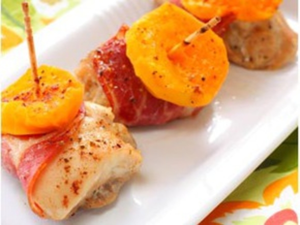 Духовку разогреть до 180 С. Каждый кусочек филе разрезать на 4 части, немного посолить и поперчить. Кусочки курицы обернуть половинкой ломтика бекона. Сверху положить половинку абрикоса , срезом вверх и закрепить зубочисткой.