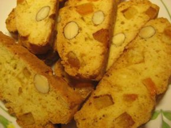 Яйца взбить с сахаром, добавить растопленное масло, ликёр, цукаты, миндаль и хорошо перемешать. Добавить муку просеянную с разрыхлителем и заместь густое тесто (если тесто будет недостаточно густым, добавить еще немного муки)