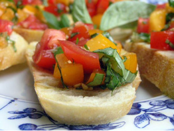 Снимите базилик с веточек и нарежьте тоненькими полосочками. Помидоры нарежьте кубиками и перемешайте с базиликом, оливковым маслом, солью и перцем.