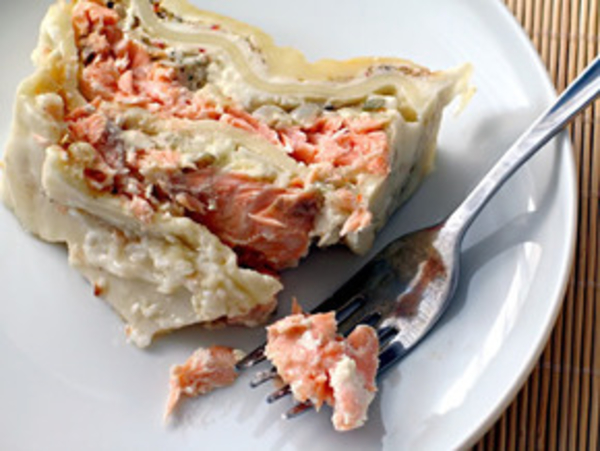 На дно формы для запекания налить 2-3 ст.л. соуса, выложить 3 листа, на них половину рыбы, половину моркови, треть соуса, далее еще 3 листа – рыба – морковь – соус, сверху 3 листа – соус – сыр.