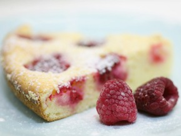 Выложите тесто в смазанную маслом и посыпанную чем-нибудь форму, разложите малину. Сверху присыпьте ложкой молотого миндаля.