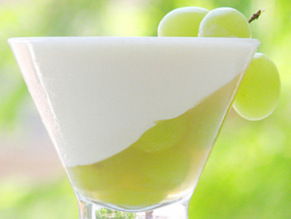 Можно поступить еще проще: бокалы не наклонять, залить виноградины желатиновой смесью и отправить в холодильник. В результате желе будет состоять из двух горизонтальных слоев - виноградного и йогуртового.Оставшуюся жидкость с желатином соединить с йогуртом и сахарной пудрой по вкусу, перемешать венчиком, чтобы смесь получилась гладкой, без комочков.