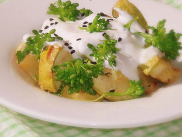 Остывшие до комнатной температуры кабачки перемешать с брокколи, полить соусом из йогурта, смешанного с толченым чесноком и щепоткой соли.