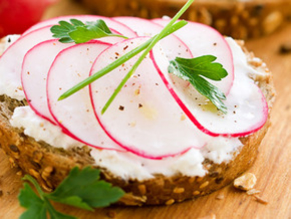 Хлеб с отрубями нарезать ломтями, намазать на каждый кусочек толстый слой козьего сыра, выложить сверху промытую и тонко нарезанную редиску. Украсить зеленью.