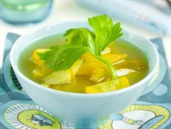 Бульон довести до кипения. Сельдерей нарезать тонкими полосками или кубиками. Добавить карри, посолить и поперчить по вкусу.