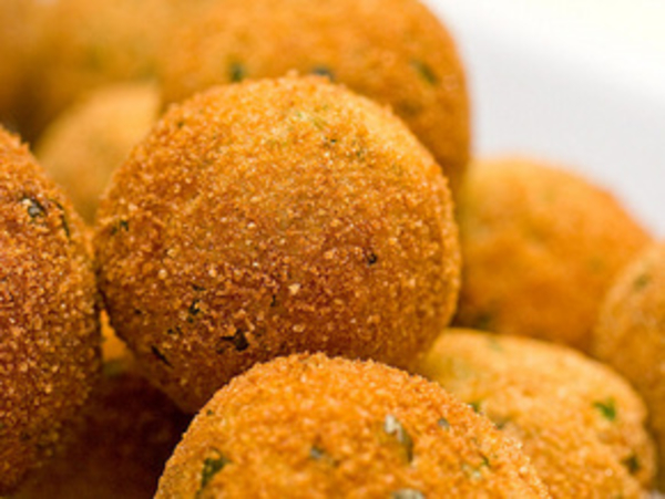 Массу поставить минимум на полчаса в холодильник. Затем мокрыми руками сделать шарики диаметром 2 см, обвалять в панировочных сухарях и жарить во фритюре на оливковом масле.