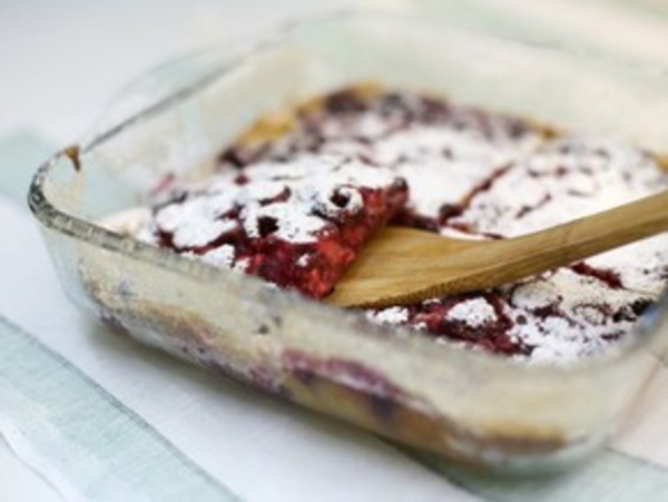 Добавьте в тесто пару ложек коньяка или кальвадоса, размешайте. Залейте малину тестом.