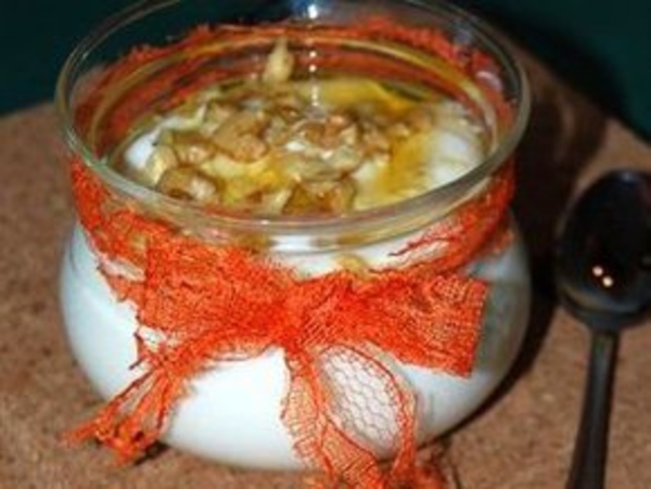 1 стакан греческого йогурта хорошо перемешать с 2 ч.л. меда и посыпать рубленными орехами. Сверху полить оставшимся медом (1 ч.л.).