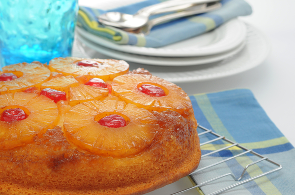 Выпекать примерно 45 минут. Проверить готовность деревянной палочкой. Вынуть пирог из духовки и оставить на несколько минут в сковороде для легкого остывания, а затем перевернуть аккуратно пирог на блюдо (низ пирога становится верхом).