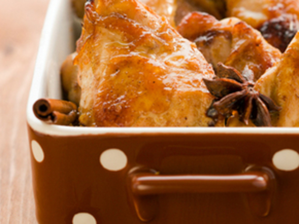 Приготовить маринад из сока, масла, соевого соуса, имбиря, корицы, чеснока, аниса, соли и перца. Замариновать курицу, оставить на ночь.