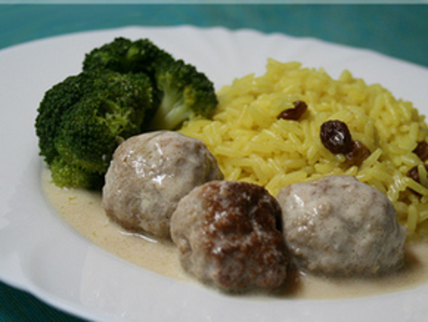 Как следует смешать фарш с карри, посолить, поперчить по вкусу. Сформировать неболшие шарики. В глубокой сковороде разогреть оливковое масло  и обжарить фрикадельки со всех сторон в течение 2-3 минут, пока они не станут коричневатыми. Добавить кокосовое молоко. Потушить минут 5-8 до готовности.