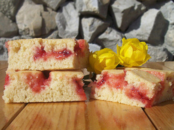 Разделить тесто на 2 части, одну выложить на смазанную маргарином форму, сверху выложить варенье, затем натереть на крупную терку оставшуюся часть теста.