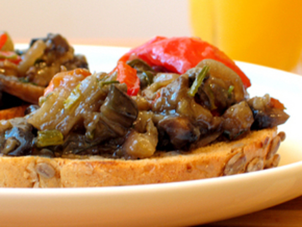 Баклажаны порезать брусочками, шампиньоны кубиками, лук четверть кольцами, паприку большими кубиками. Добавить все овощи к острому перцу. Немного протушить под крышкой, несколько раз перемешав.