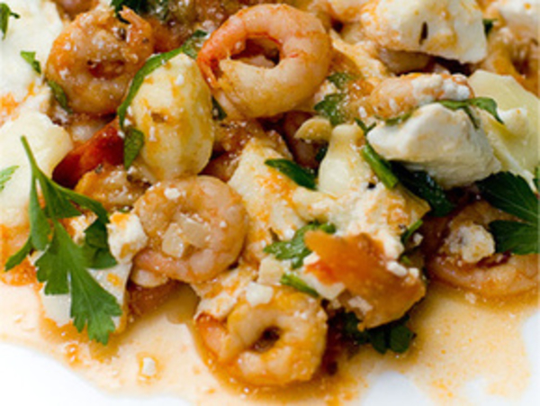 Добавьте помидоры, соль и креветки. Тушите еще минут 5. Выложите креветки с соусом в форму для запекания и сверху распределите брынзу и моцареллу. По желанию сбрызните дополнительным оливковым маслом. Запекайте 10 минут при температуре 180 градусов. Готовое блюдо посыпьте петрушкой и сразу подавайте.