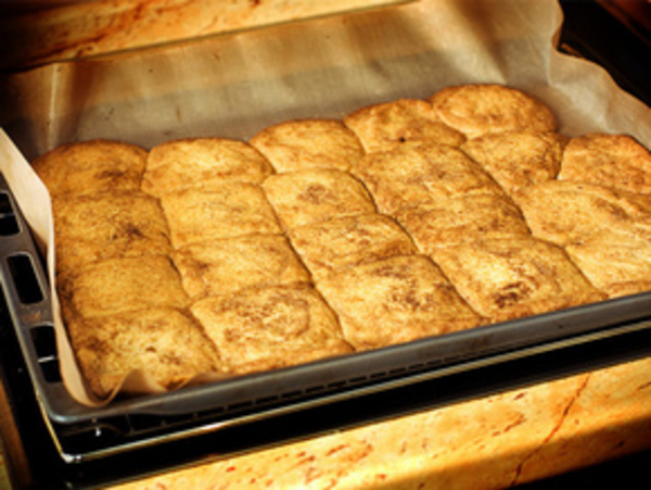 Разогрейте духовку до 180 C. Смажьте противень маслом. Смешайте в маленькой мисочке 2 ст.л. сахара и корицу. Из теста сформируйте шарики и обваляйте каждый в сахаре с корицей. Выложите шарики на противень на расстоянии ~7 см друг от друга и выпекайте 12-15 минут или пока края печенья не подрумянятся. Оставить печенье остывать на противне, пока оно не станет теплым и немного затвердеет.