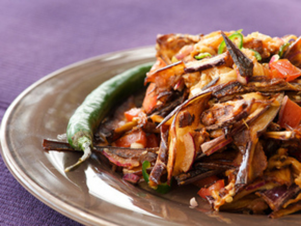 Очищаем помидоры от семян. Режем небольшими кубиками. Перец тонкими кольцами, лук мелкими кубиками. Выкладываем на баклажаны, поливаем соком половинки лайма, солим и перчим.