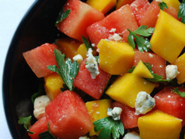 Арбуз и манго смешать с красным перцем и петрушкой. Охладить в холодильнике. Добавить лаймовый сок и сыр, аккуратно перемешать. Подать к столу.