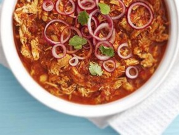 Вытянуть курицу из кастрюли, разорвать на кусочки двумя вилками, а затем обратно добавить в соус. Добавить немного лука шалот и кориандра.