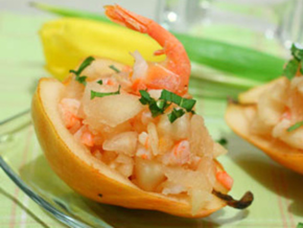 Креветки порезать небольшими кусочками, смешать с мякотью груши. Получившуюся начинку смешать с майонезом, выложить в половинки груш. Украсить листиками мяты.