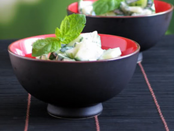 Удалить семена у огурцов, мелко порубить. Положить в дуршлаг, посолить, оставить на 15 минут. Промыть под холодной водой, обсушить бумажными полотенцами. Смешать огурцы, йогурт и мяту. Этот салат отлично подходит к мясу.
