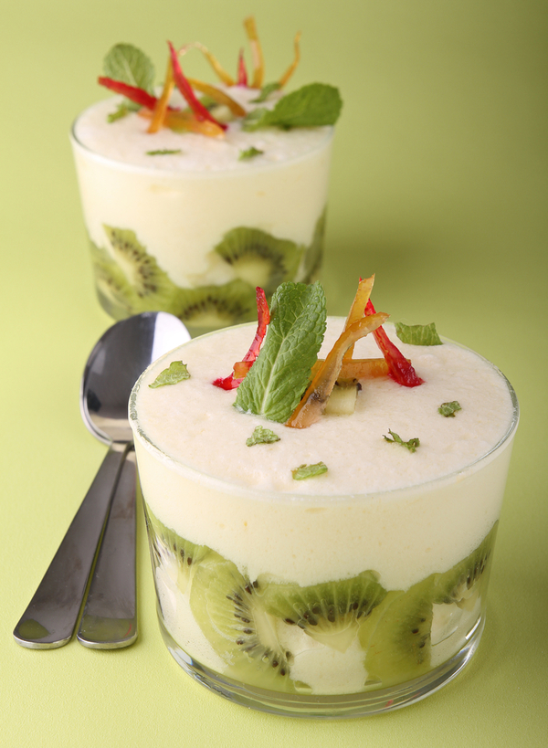 В креманки разложить 2-3 киви (или другие фрукты-ягоды) порезанные на кусочки , залить муссом из зефира, охладить на протяжении 1 часа. Можно украсить шоколадной стружкой.
