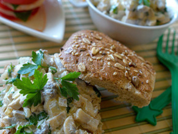Смешать сметану, грибы, лук, петрушку. Посолить и поперчить. Разрезать булочку пополам и намазать грибной массой.