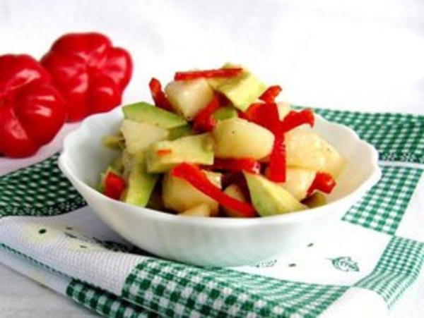 Лучше, если авокадо перед приготовлением салата полежит пару часов в холодильнике. После этого его чистим, режем кусочками. Также очищаем и нарезаем кусочками грушу. Перец - тонкими полосками.