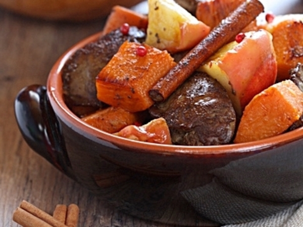 Печень очистить от пленок и жира, быстро обжарить на сковороде в разогретом растительном масле. Яблоки и тыкву нарезать кусочками. Тыкву обжарить со всех сторон на небольшом количестве растительного масла.