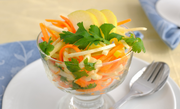 Яблоко очистить от кожицы и семян. Натереть тыкву и яблоко. Заправить салат лимонным соком, сахаром и маслом, перемешать.