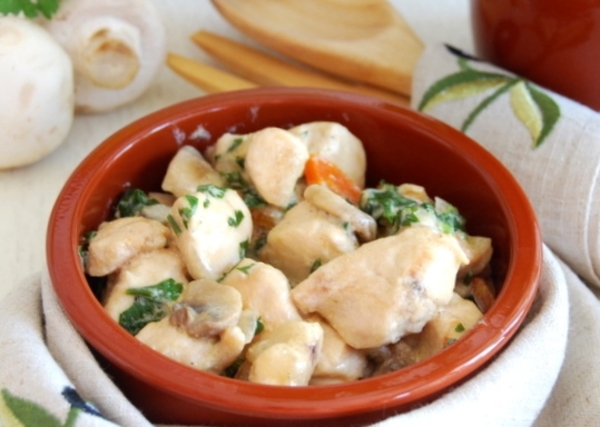 Куриные грудки порезать небольшими кубиками. Готовить на 2-х сковородах. На одной сковороде на сильном огне обжарить куриное мясо до золотистой корочки. На другой сковороде обжарить грибы, лук и морковь в течении 5-7 минут, периодически помешивая. Переложить курицу к овощам, посолить поперчить, залить сливками и тушить 10-15 минут. Посыпать рубленой зеленью петрушки, закрыть крышкой и дать постоять ещё 5 минут. Подавать с рисом.