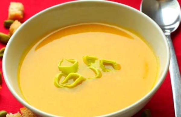 Овощи залить горячим бульоном, готовить до мягкости. Суп пюрировать с помощью блендера. Оставшееся масло растопить в маленькой сковордке. Хлеб нарезать кубиками, обжарить в масле до румяной корочки, посолить по вкусу, добавить пармезан. Подать суп с гренками и поджаренными тыквенными семечками.