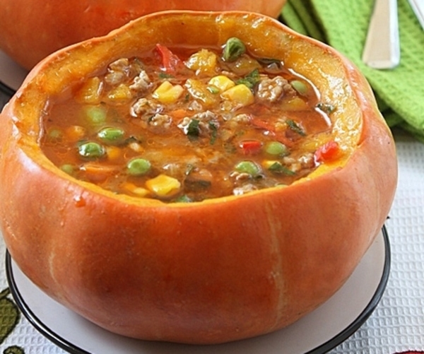 Срезать верхнюю часть тыквы. Ложкой извлечь мякоть, оставив слой толщиной в 2-3 сантиметра. Мякоть очистить от семян и нарезать кубиками . Стручок чили перца очистить от семян и мелко нарезать. Лук очистить и мелко нарезать.Чеснок очистить и раздавить кухонным прессом. Мясной фарш обжарить и приправить солью и карри. Петрушку измельчить. Мякоть тыквы и репчатый лук обжарить на растительном масле на сковороде в течении 5 минут. Добавить перец чили, чеснок, томатную пасту. Залить овощным бульоном и варить 10 минут.