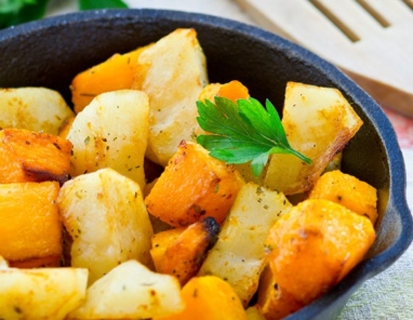 Жареный картофель с тыквой – необычное блюдо, которое можно готовить в пост или подавать как овощной гарнир к мясным блюдам