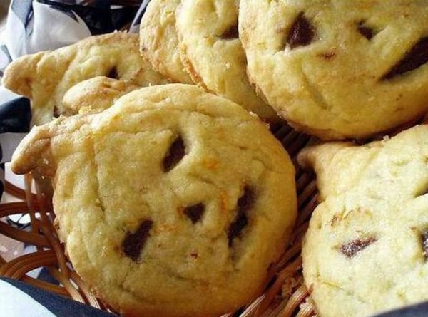 Небольшим острым ножом вырезать "глаза", "нос", "рот" на 12 кругах теста. Промазать начинкой круги без рисунка, положить сверху рожицы и слегка прижать. Из остатков теста слепить тыквенные хвостики и приделать их к печенью. Прочертить ножом расходящиеся от верха лучи.
