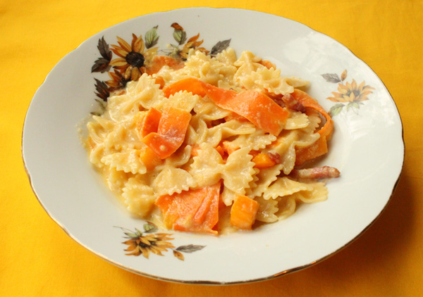 Параллельно отварить фарфалле, смешать соус с поджаренной морковью и грудинкой. Оставить несколько ломтиков моркови и пару кубиков тыквы для украшения.