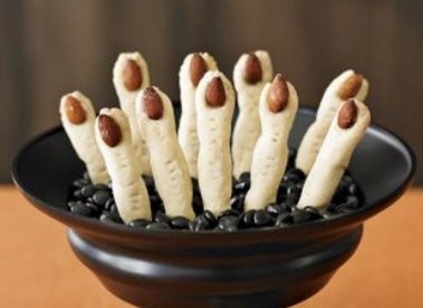 4. Когда печенье будет готово, вынь миндаль и прикрепите их к пальцам, обмакнув в красный джем. Для придания особого колорита, можешь вымазать джемом кончики некоторых пальцев.