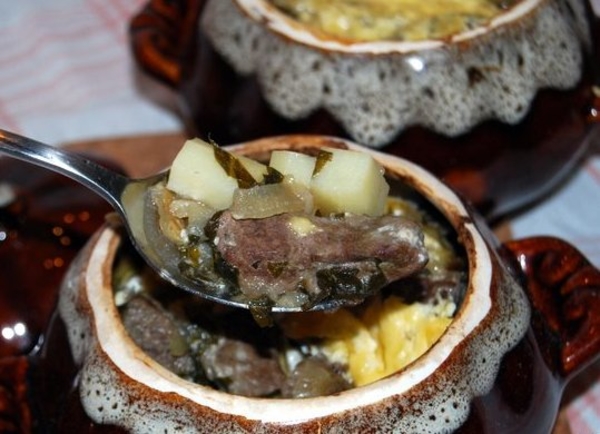 На дно каждого горшочка положить по маленькому кусочку сливочного масла, нарезанный картофель, посолить и положить по маленькому лавровому листочку. На картофель плотно уложить печень, добавить горячей воды (примерно до половины горшочка), верх смазать сметаной и посыпать тёртым сыром. Закрыть крышками и поставить в духовку. Готовить 1 час при температуре 200 С.