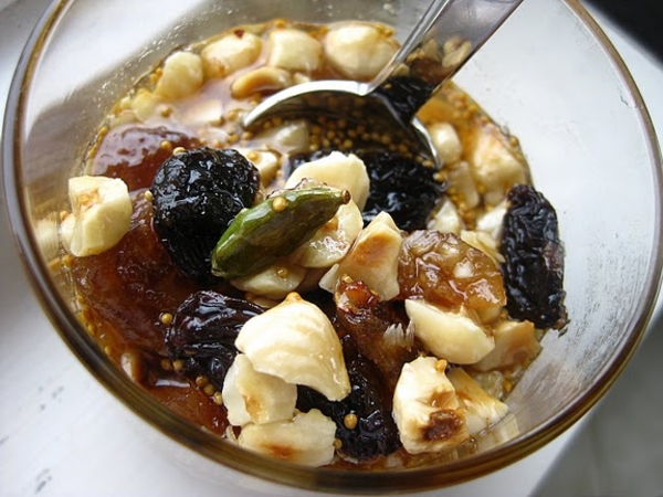 Измельчи орехи (кешью, миндаль, грецкие) и сухофрукты (финики, курагу, чернослив, сушеную вишню). Добавь жидкий мед и перемешай.