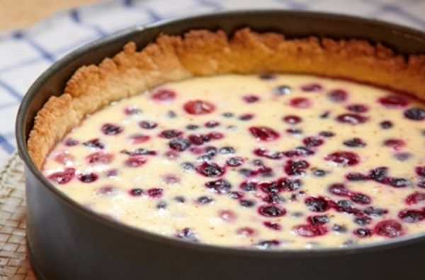 Для заливки в отдельной чашке смешать сметану, яйца, сахар и семена ванили (ванильный стручок нужно острым ножом разрезать пополам и "соскрести" семена. Выложить ягоды на основу и залить сметанным кремом.