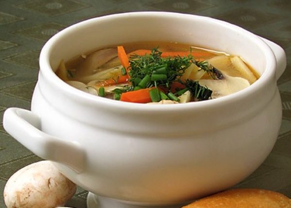 Овощи порезать тонкой соломкой, грибы - тонкими пластинками. Бульон довести до кипения, добавить в него пасту. За 5 минут до готовности пасту добавить овощи и грибы. Готовый суп посыпать зеленью.
